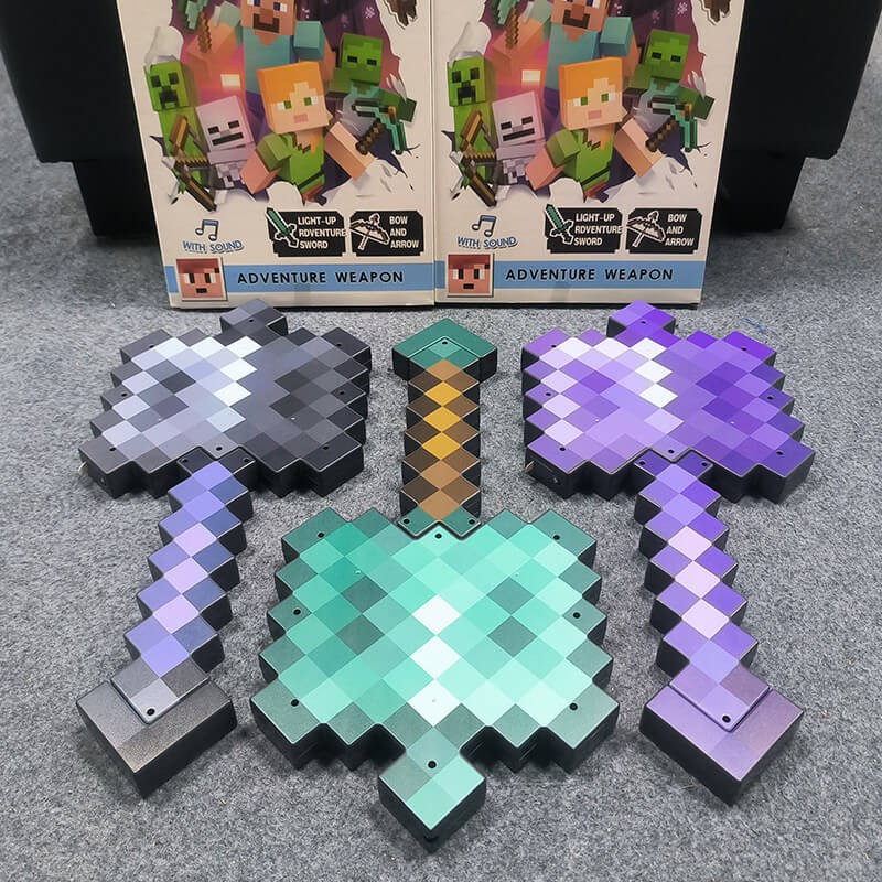 Multiple Variants Available: Sword-pickaxe 2-in-1, firing pixel bow & arrow, 11-color diamond sword, RGB torch, lantern, potion night lights & more.